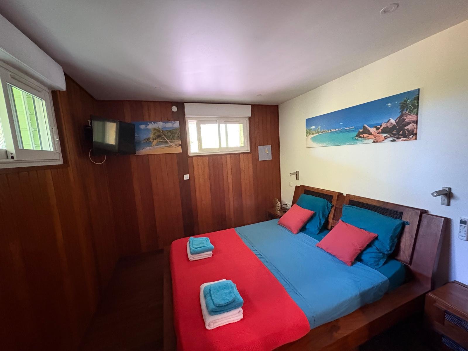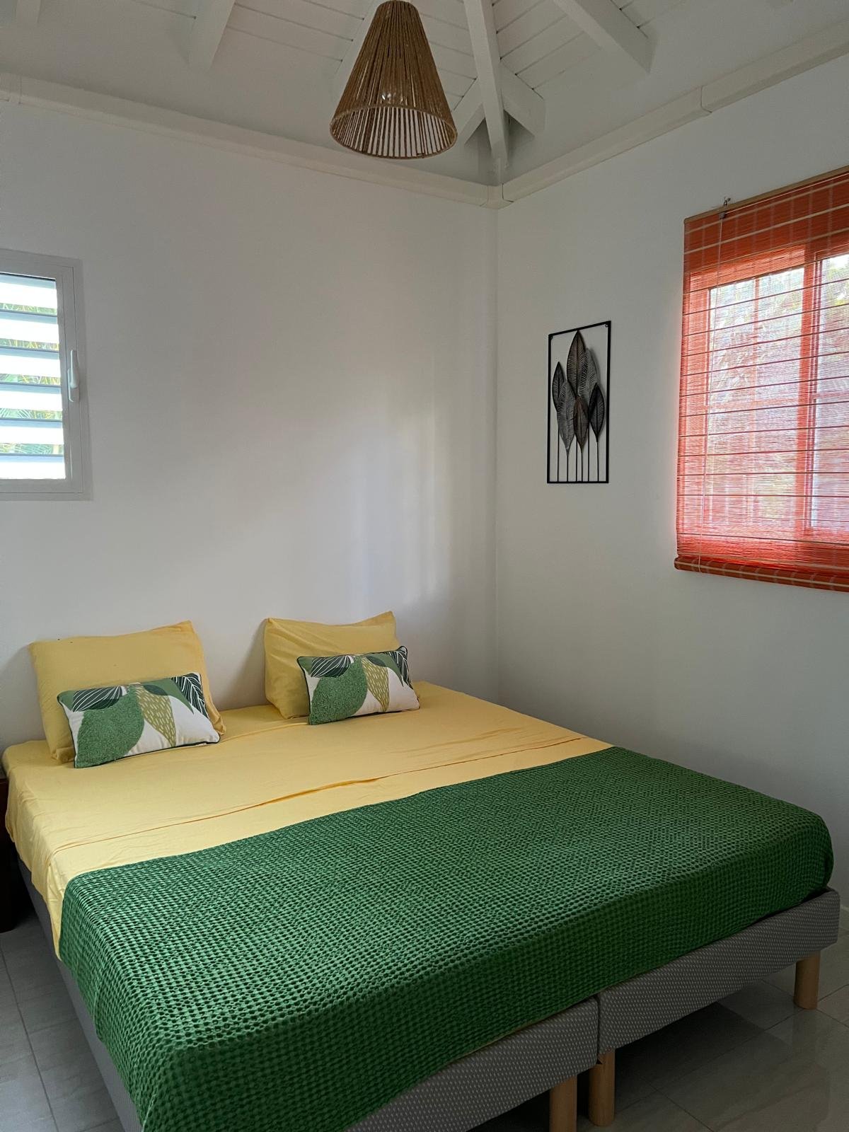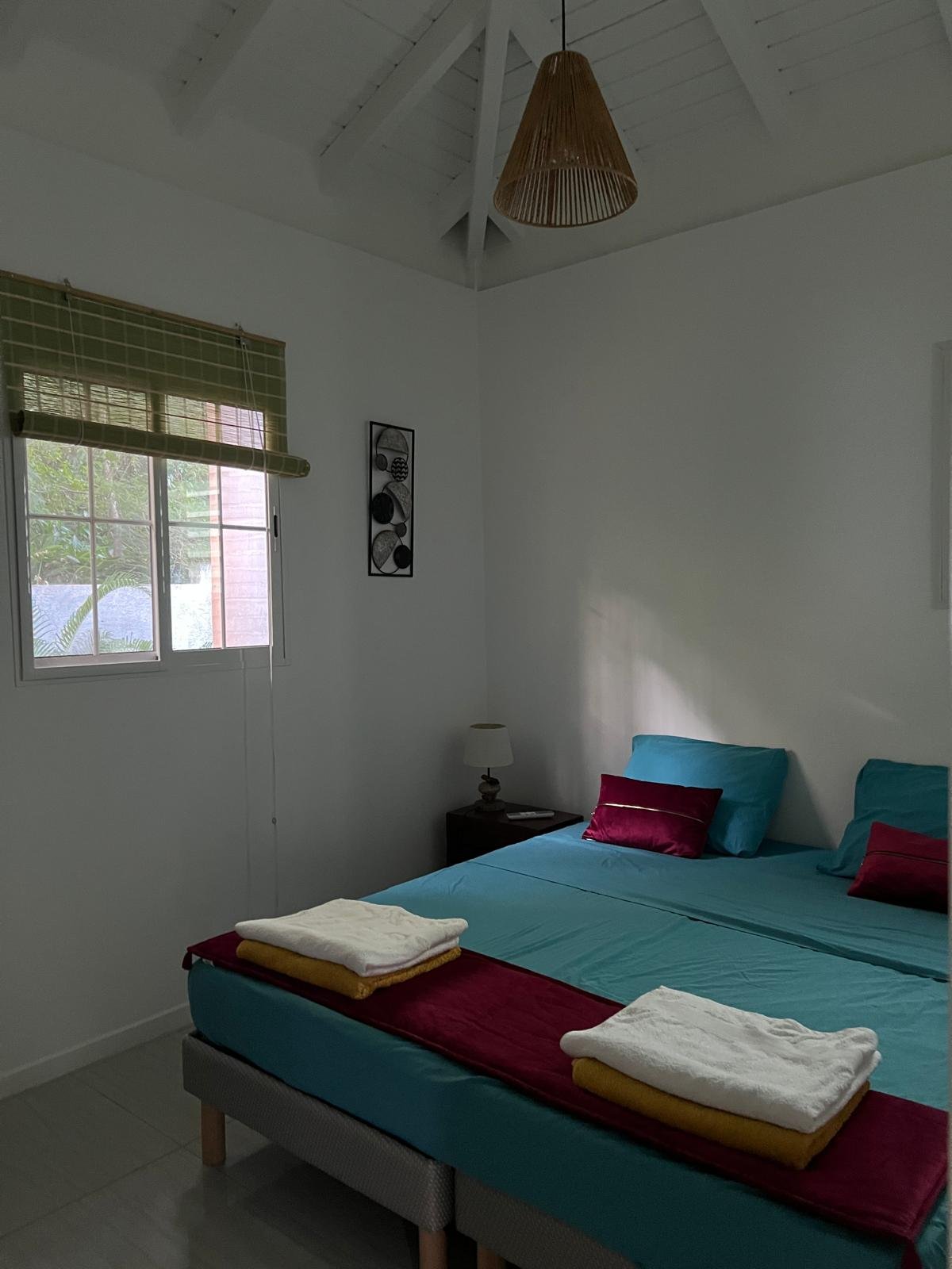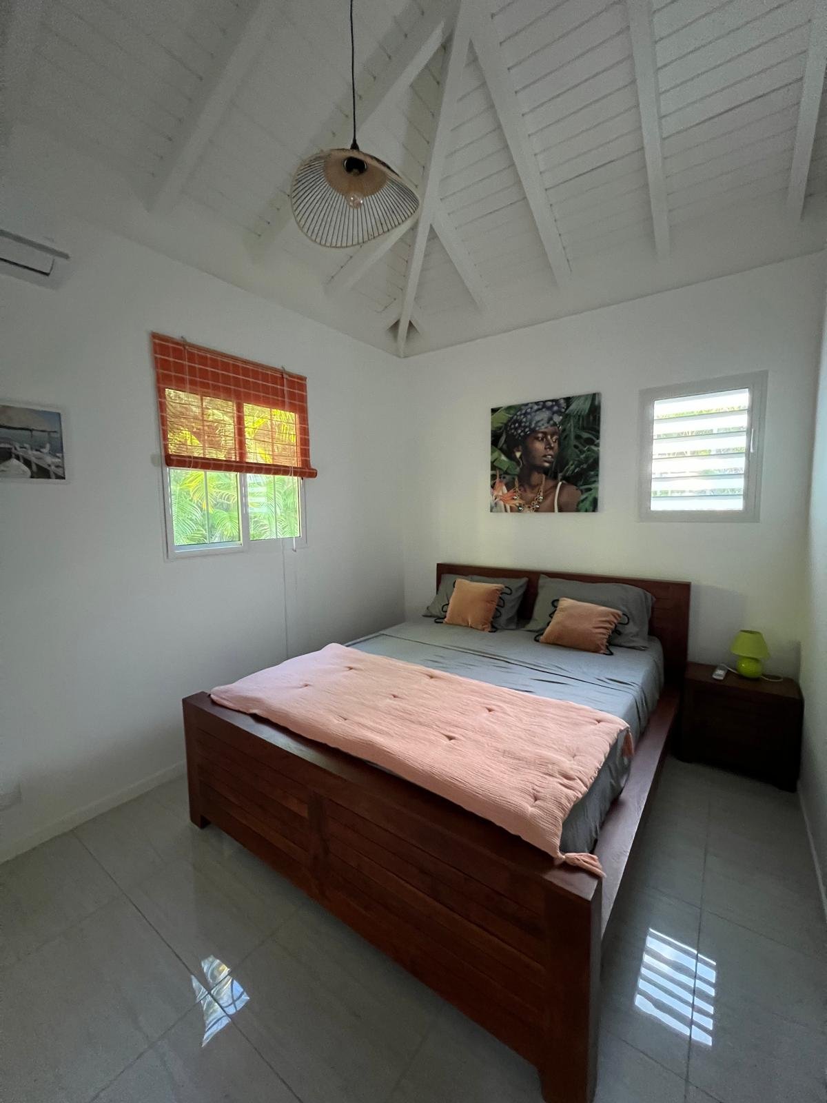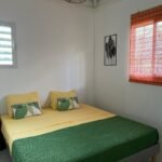 70 m² pour 2 à 6 personnes, 2 chambres climatisées (lits doubles, dressings), piscine privée sans vis-à-vis entourée d’un deck et d’un carbet. Cuisine ouverte tout équipée, terrasse couverte avec barbecue et douche extérieure, déco caribéenne contemporaine aux couleurs vives.