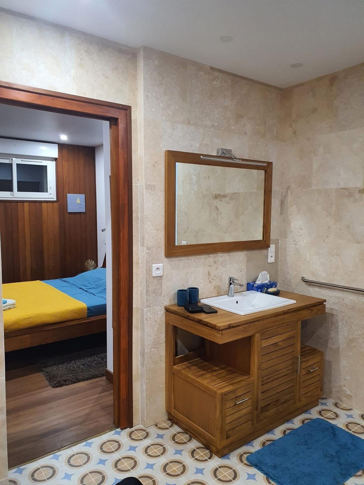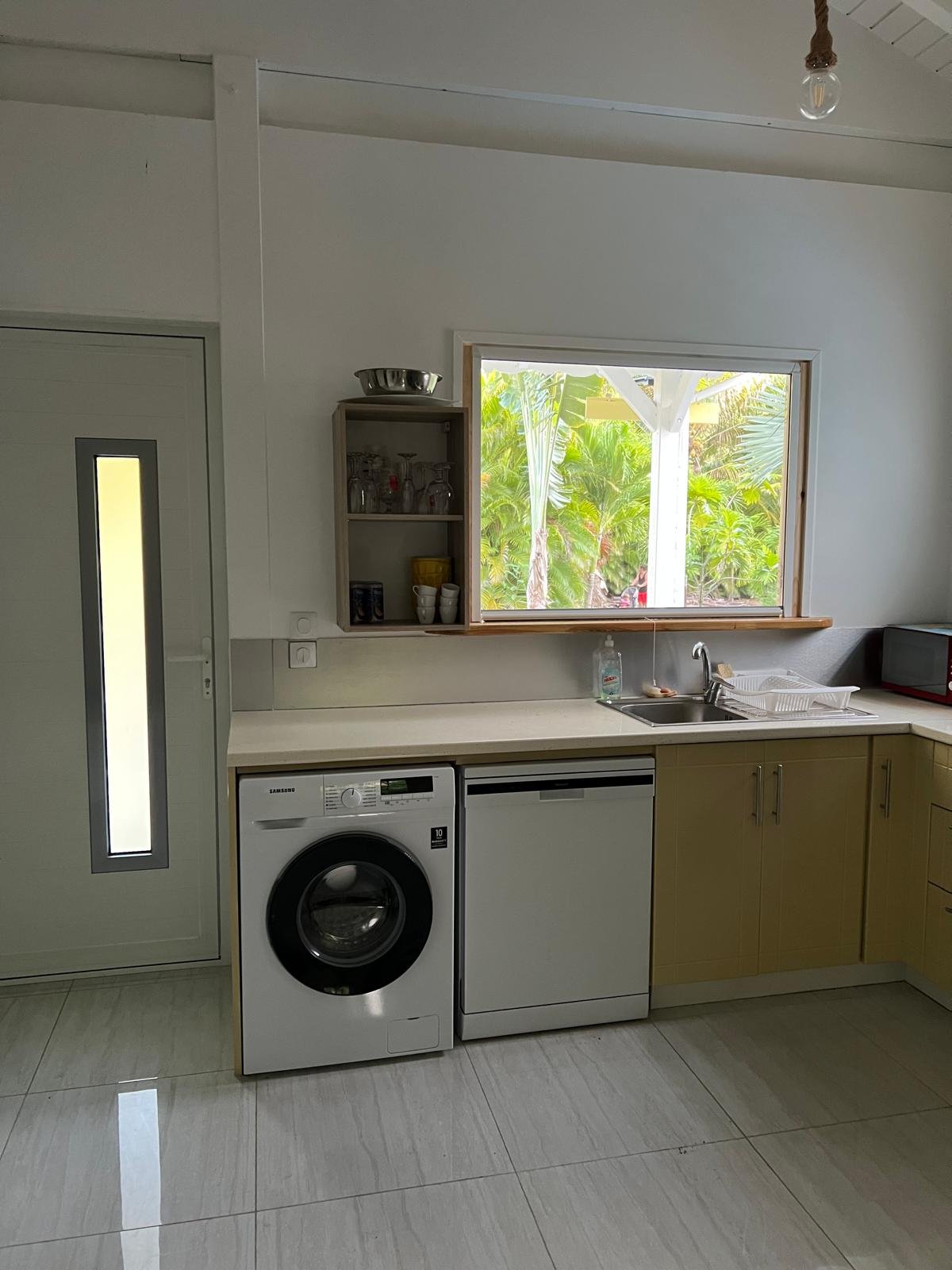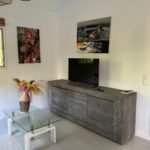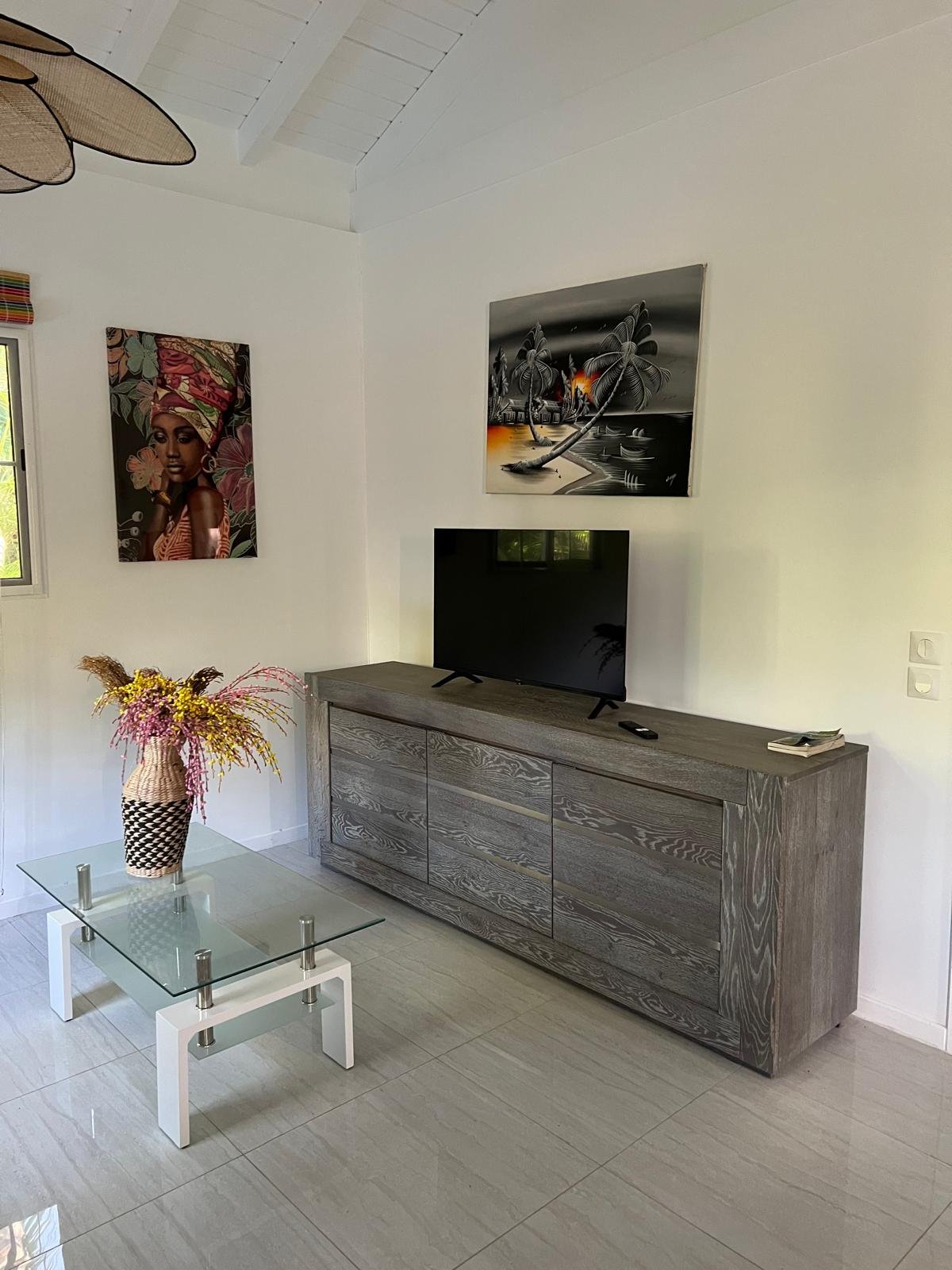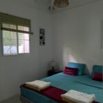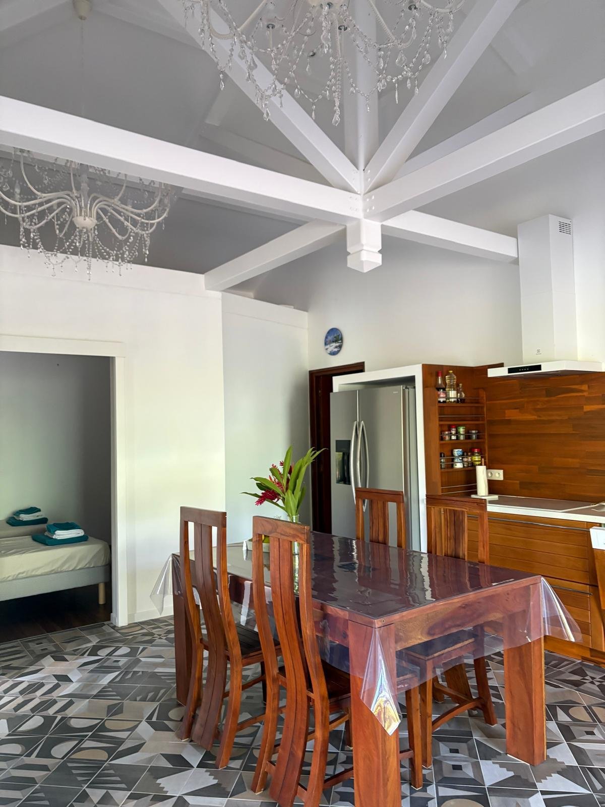 70 m² pour 2 à 6 personnes, 2 chambres climatisées (lits doubles, dressings), piscine privée sans vis-à-vis entourée d’un deck et d’un carbet. Cuisine ouverte tout équipée, terrasse couverte avec barbecue et douche extérieure, déco caribéenne contemporaine aux couleurs vives.