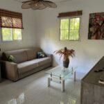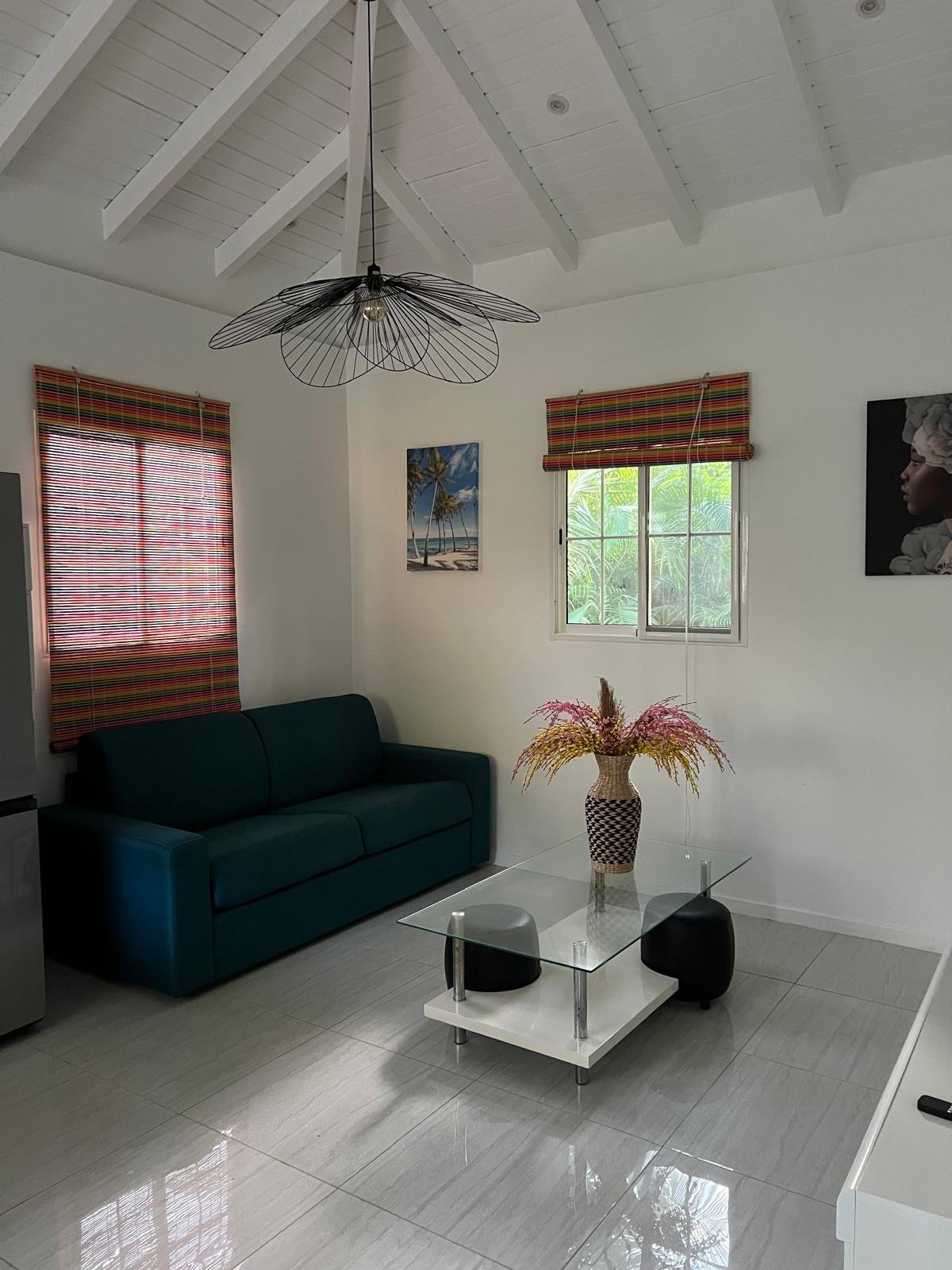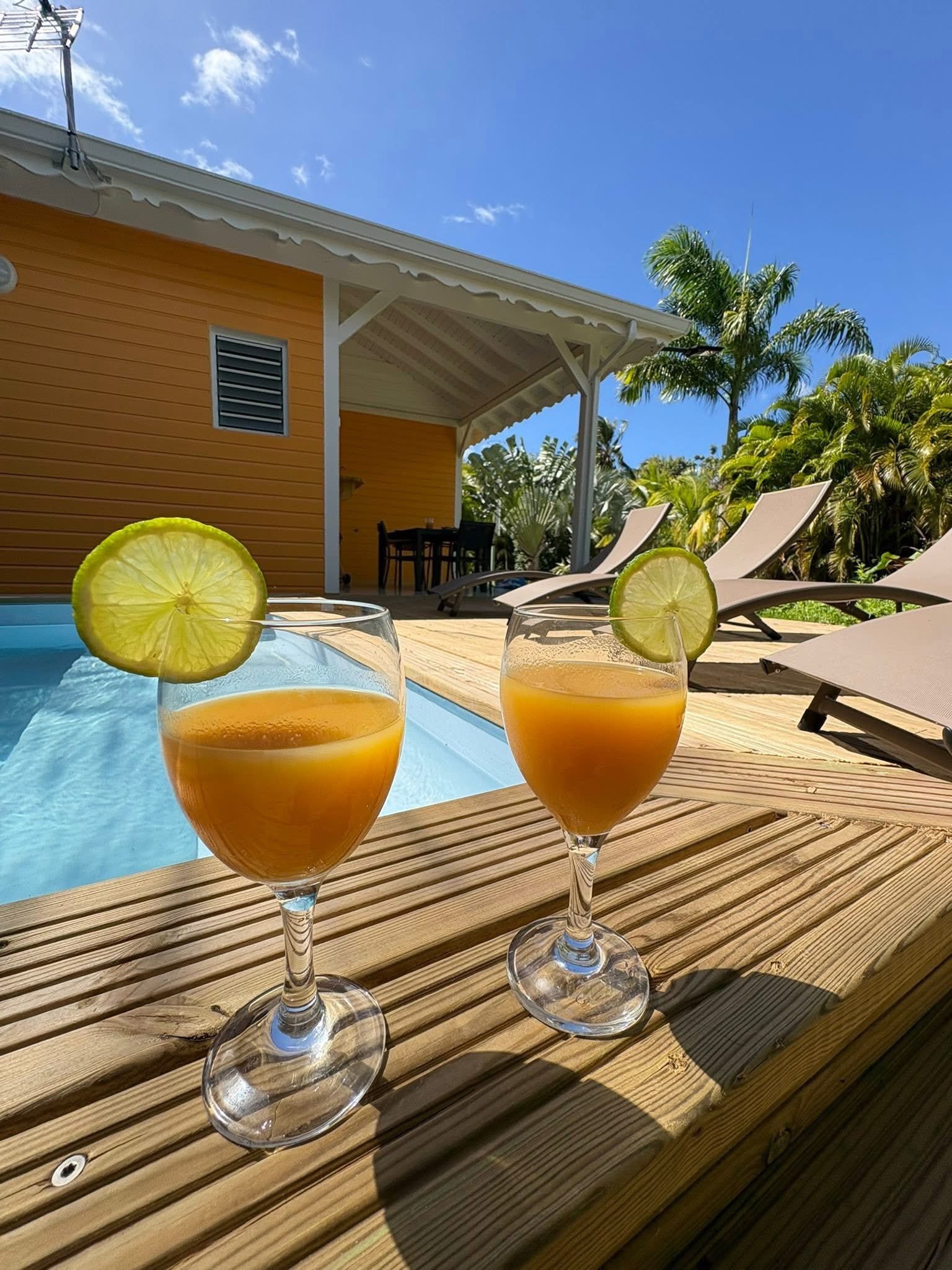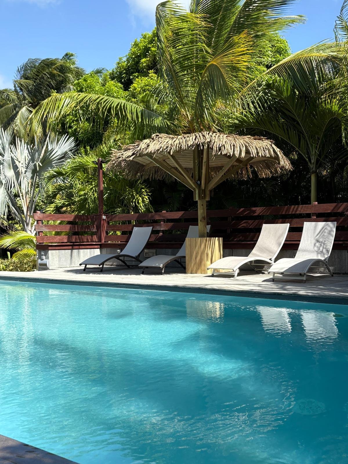 70 m² pour 2 à 6 personnes, avec 2 chambres climatisées (lits queen-size), piscine privée entourée d’un deck ensoleillé. Cuisine tout équipée, terrasse couverte avec barbecue, salon cosy et déco caribéenne vibrante.